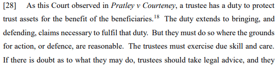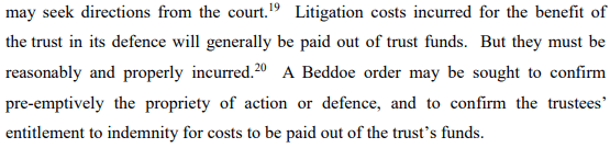 The ability to seek costs in trust litigation is largely centered around the nature of the proceedings and whether the trustees’ stance is functionally “administrative” or “hostile.” There are different approaches to differentiation variously referred to in Buckton, Alsop and the learned authors of Lewin, which are set out in McCallum.