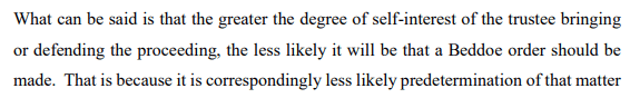 McCallum v McCallum concerns an appeal against partial Beddoe orders. At the opening of his novel Anna Karenina, the Russian novelist Tolstoy writes “All Happy families resemble one another, but each unhappy family is unhappy in its own way.” A similar sentiment may well apply on the context of trust disputes. Accordingly, the facts of McCallum (for more background see Disclosure of legal advice), while important in the context of that case, do not necessarily advance or detract from the consideration regarding the merits of Beddoe orders.