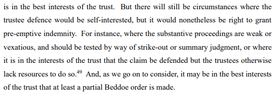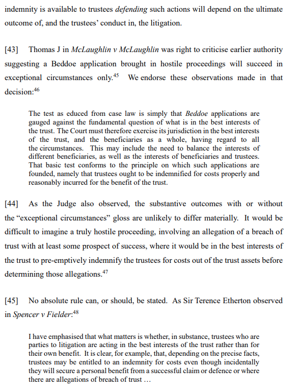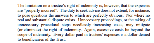The ability to seek costs in trust litigation is largely centered around the nature of the proceedings and whether the trustees’ stance is functionally “administrative” or “hostile.” There are different approaches to differentiation variously referred to in Buckton, Alsop and the learned authors of Lewin, which are set out in McCallum.