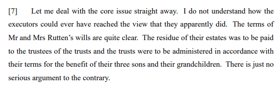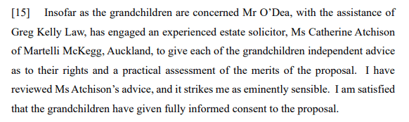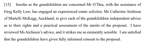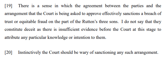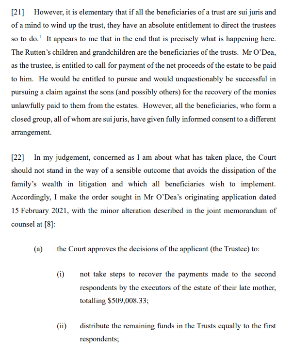 Essentially the Court sanctioned the use of the rule in Saunders v Vautier to remedy the breach (although it is observed that while the Court respected the pragmatic outcome there was a mix of dismay and despair regarding the events that lead to the proceedings).