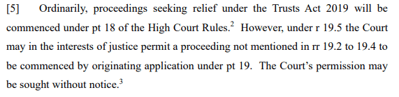In Toogood the Court is satisfied (as noted at [10]) that “… it is appropriate to grant the applicant leave to proceed under pt 19. The disclosure that is sought is not wide-ranging and the dispute falls within a very narrow compass. The applicant will rely primarily on the statutory provisions in the Trusts Act for the relief sought.”