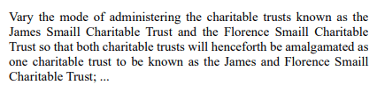 As a practical matter the annual costs to administer the Florence Smaill Charitable Trust (FSCT) exceeded its income. The amalgamation proposal was intended to be effected by a resettlement of the assets of the FSCT onto the James Smaill Charitable Trust whose name would be varied to the James and Florence Smaill Charitable Trust.
