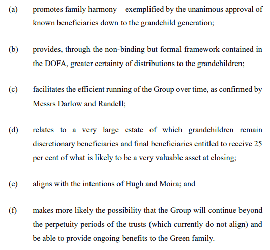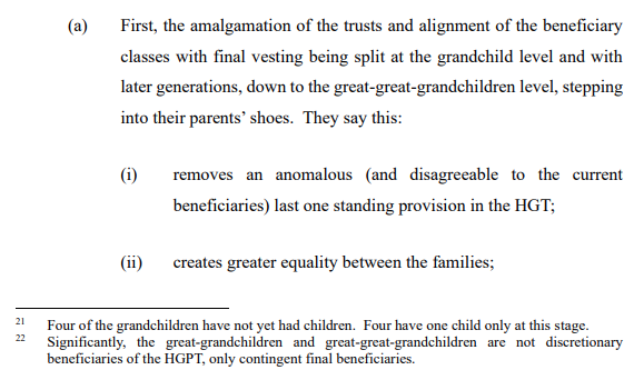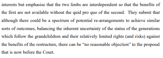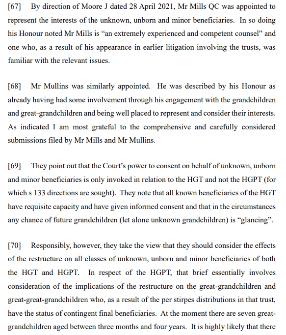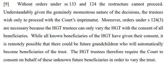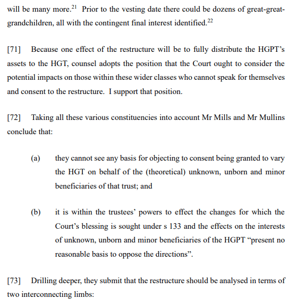 The court was highly satisfied with the submissions made regarding the unborns, unknown and minor beneficiaries. Seemingly in large part due to the high degree of contingency and remoteness, but also noting the following grounds of the restructure, which: