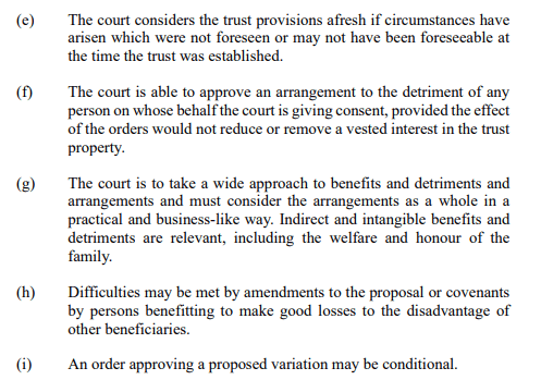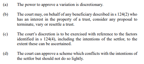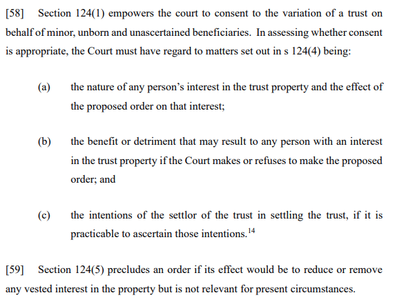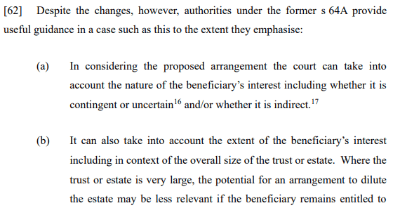 Importantly s 124 of the Trusts Act differs from its predecessor section 64A of the Trustee Act as previously as noted at [61] “… the the court could not approve variations that were detrimental to the beneficiaries’ interests. Under the new Act benefits and detriments are factors to be taken into account alongside the nature of the interest and the settlor’s intentions.”