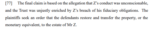 Pulling together the relevant considerations, the court concluded that there was a fiduciary relationship between Mr Z and the plaintiffs at the time he gifted property to the Trust and that this was a deliberate step to ensure that his estate would not be available to meet the plaintiff’s needs and that this transfer was in breach of the fiduciary obligations he owed his children.