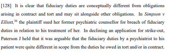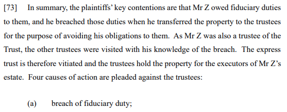 Pulling together the relevant considerations, the court concluded that there was a fiduciary relationship between Mr Z and the plaintiffs at the time he gifted property to the Trust and that this was a deliberate step to ensure that his estate would not be available to meet the plaintiff’s needs and that this transfer was in breach of the fiduciary obligations he owed his children.