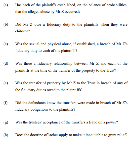 The plaintiffs are the three surviving adult children of Mr Z (deceased). The three plaintiffs alleged abuse and sued the surviving trustees of a trust settled by Mr Z. As noted at [2] of the decision, “The practical effect of those dispositions (and