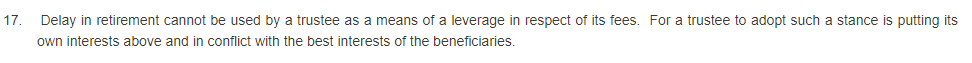 It is suggested that any trustee who resists retirement is wise to consider the propriety of any costs that flow from this. Where trustees and beneficiaries are not collectively in alignment it must be asked how the trustees will best serve the beneficiaries for whom they act. importantly, this statement refers to alignment in a global sense; not a partisan relationship between a trustee or trustees with one or more beneficiaries to the potential detriment of others. In this regard we refer to the following passage from the Supreme Court decision in Lambie v Addleman.