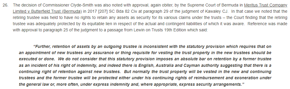 In the Matter of the Velloz Settlement the outstanding fees were significant and in the order of £3.5 million. No security was ordered to be provided. However, in that case the Court was satisfied that there was an undertaking regarding a “ringfenced fund” within the Trusts of £4 million for the period necessary to resolve claims regarding the retiring trustee’s costs, fees and expenses.