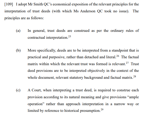 Importantly counsel (Jane Anderson QC) was appointed to assist the court – not to act for the beneficiaries who were essentially represented by the Attorney General – but to collate and communicate opposing positions.