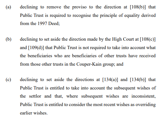 Separately the Supreme Court noted that the scope and meaning of s 21 of the Trusts Act 2019 (in performing mandatory and default duties a trustee must have regard to the context and objectives of the Trust) may be a question of general and public importance. However, it did no see Kain v Public Trust as an appropriate vehicle to consider that section.