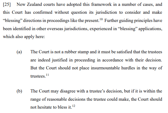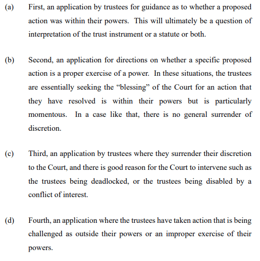The court appointed trustee sought the blessing of the court pursuant to section 133 of the Trusts Act 2019 with respect to that trustee’s proposed course of action. The court helpfully sets out the types of applications that can be subject to an application for directions at [23]: