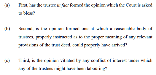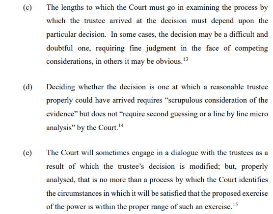 The court appointed trustee sought the blessing of the court pursuant to section 133 of the Trusts Act 2019 with respect to that trustee’s proposed course of action. The court helpfully sets out the types of applications that can be subject to an application for directions at [23]: