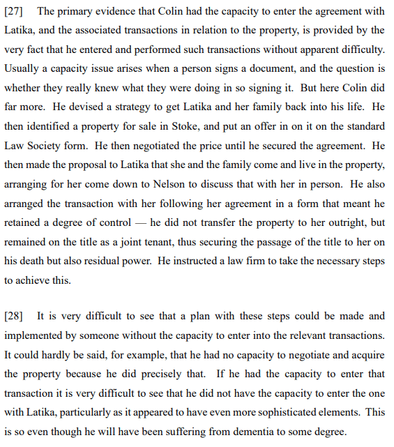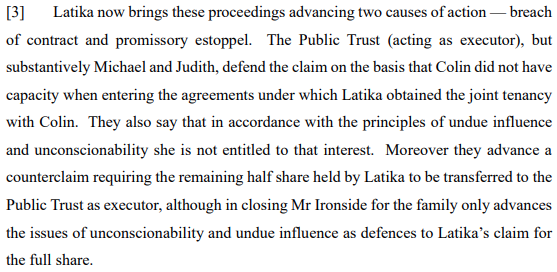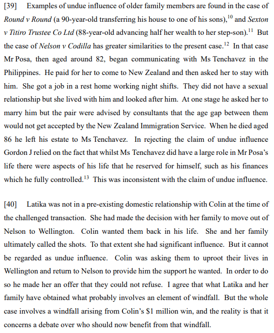 The allegation of undue influence was similarly denied. The reasons for this were simply that as noted by Cooke J: “the transactions involved a quite careful plan implemented by Colin to get Latika and her family back into his life. Rather than them being a product of Latika’s undue influence, they were the product of Colin’s shrewdly devised strategy to achieve the most happiness he could in his remaining years.”