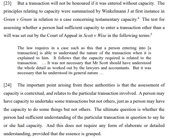 The first leg advanced by Mr Friend’s family to defend Mrs Sen’s claims related to capacity. The following passages from Sen v Public Trust provide useful, practical guidance regarding the assessment of capacity in light of a decision made by an elderly man who was wanting to remain in his home with people who he wanted to entice back to care for him and to allow him to live where he chose: