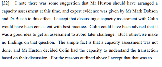 It may well have been sensible for the lawyer acting on Mr Friend’s purchase of the Stoke property to have recommended a capacity assessment. In this regard, as noted at [32]: