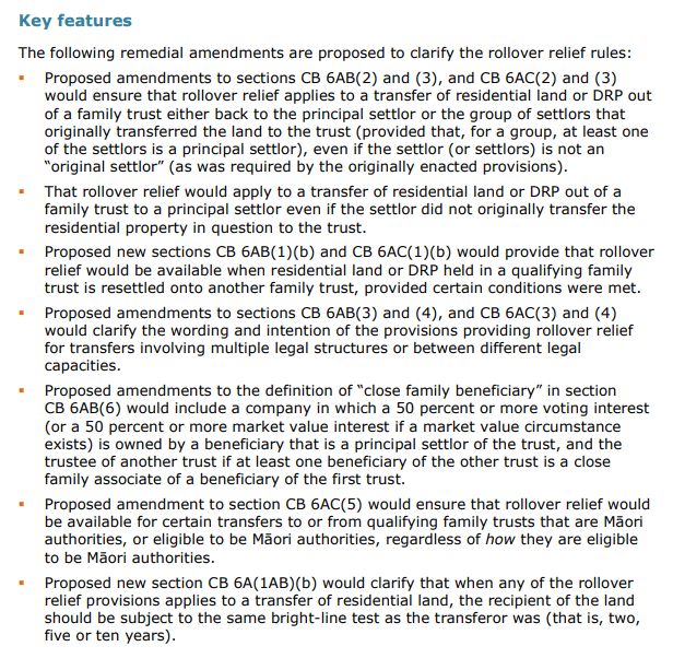 - amendments to allow rollover relief in respect of the bright-line test in relation to specified transfers to or from family trusts including resettlements