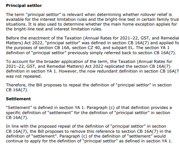 - amended definition of principal settlor and settlement for the for the bright-line test and and the interest limitation rules