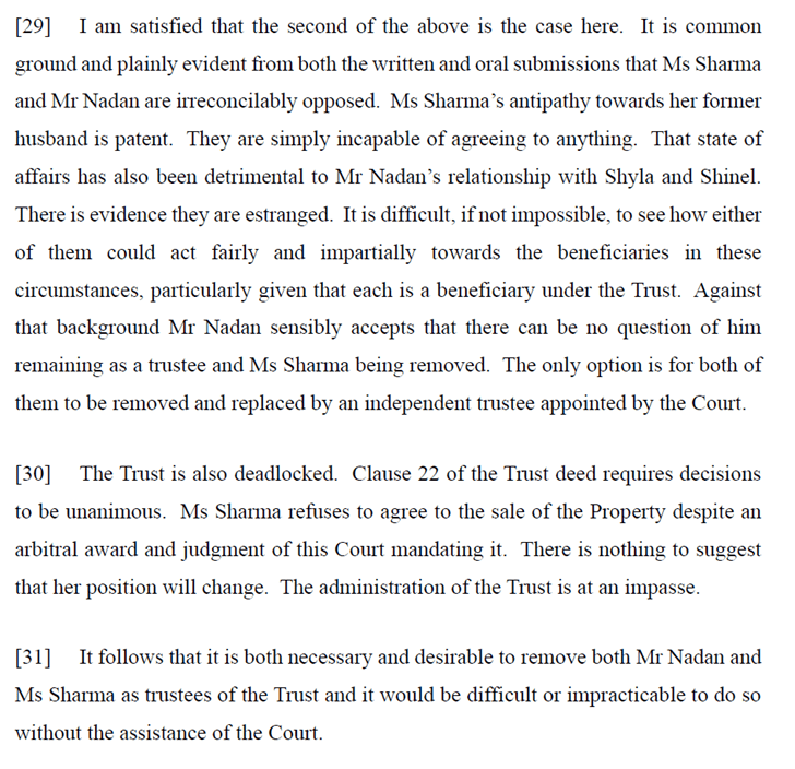 Mr Naden sought the removal of both trustees pursuant to section 112 of the Trusts Act on the basis that Ms Sharma had unilaterally commandeered the administration of the Trust and refused to comply with the second arbitral award and that neither of the trustees were able to fulfil their duties as trustees.