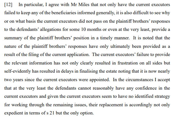 Disclosure requests in the context of trusts, wills and estate can raise complex issues that can require the assistance of the court to resolve, particularly following the introduction of the Trusts Act 2019 and before the expected case law that will be realised in due course. However, in some cases it is simply a matter of getting on with it. Van Rijn v Van Ryn provides such an example. In this case executors were appointed in a contentious estate matter by consent in November 2020 following a mediation. However, by May 2021 the estate still had not been finalised and although the principal assets had been distributed, information requests had been largely ignored. As noted at [6]:
