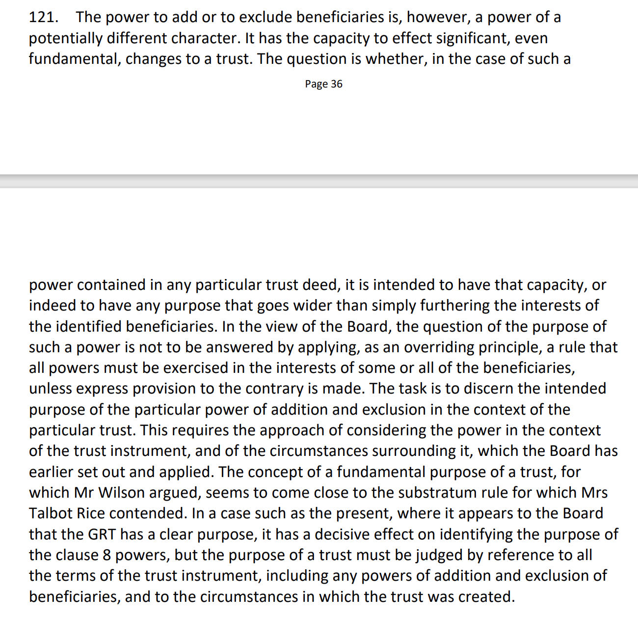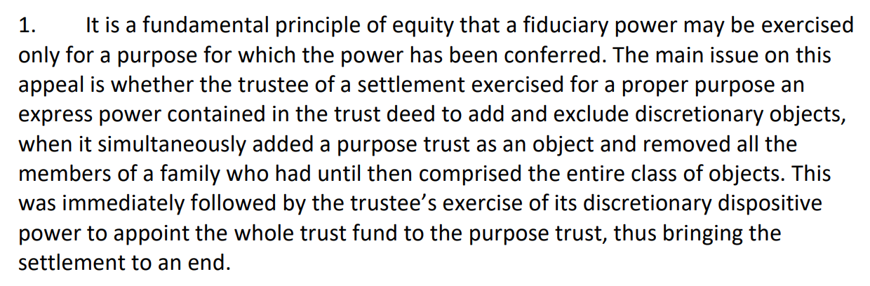 The fundamental question was the exercise of powers that allowed a beneficiary not named in the terms of a trust to benefit from the exercise of trustee powers. The conclusion was that the trustees had not exercised powers for a proper purpose, as is canvassed in the following [121]:
