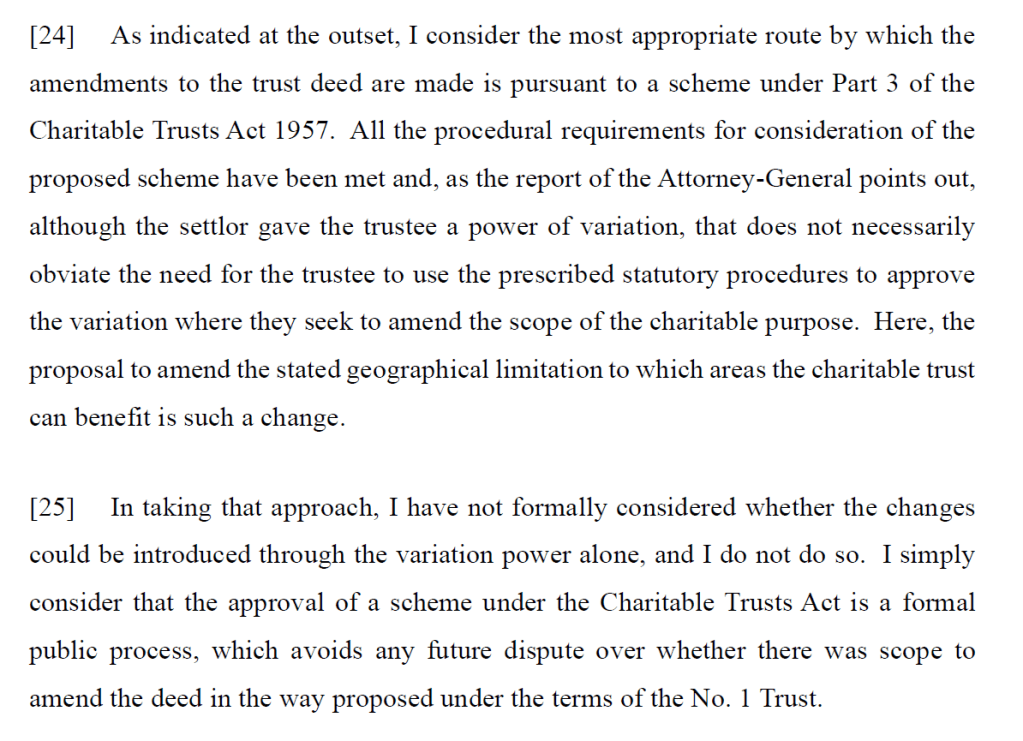 Also see Re Kathleen Dorothy Kirkby Charitable Trust where Jagose J approved a variation to a charitable trust “… to enable the trustee to give effect to the trust’s charitable purposes and the settlor’s ultimate intentions to all beneficiaries’ benefit, and without which all beneficiaries would detrimentally be affected by the trustee’s likely inability to make significant distributions after the settlor’s death, including by modernising its terms consistently with the Trusts Act 2019.” As noted at [9]: