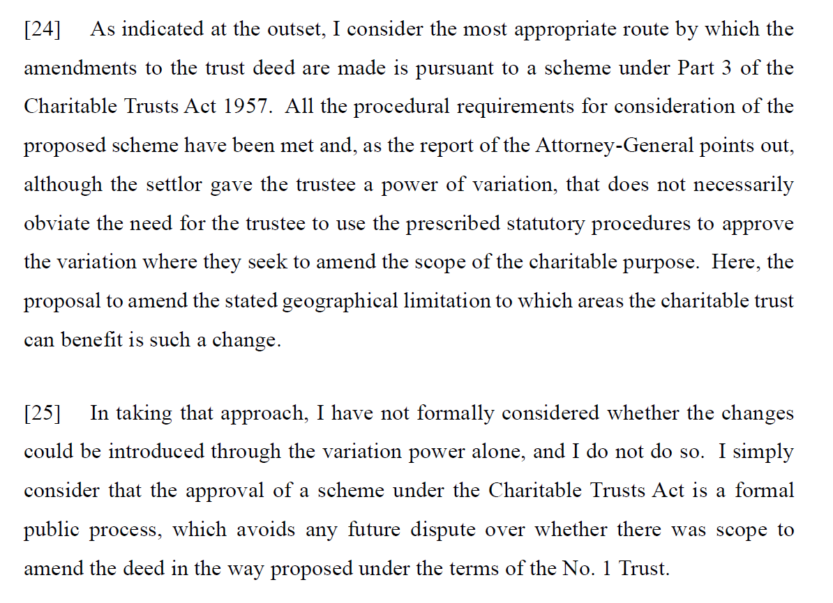 Also see Re Kathleen Dorothy Kirkby Charitable Trust where Jagose J approved a variation to a charitable trust “… to enable the trustee to give effect to the trust’s charitable purposes and the settlor’s ultimate intentions to all beneficiaries’ benefit, and without which all beneficiaries would detrimentally be affected by the trustee’s likely inability to make significant distributions after the settlor’s death, including by modernising its terms consistently with the Trusts Act 2019.” As noted at [9]:
