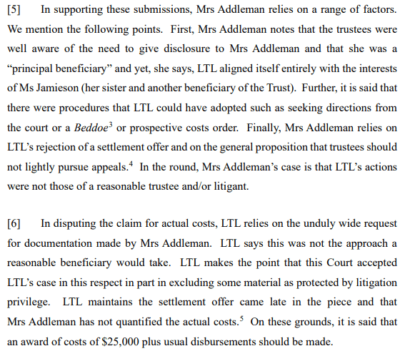 Mrs Addleman sought reimbursement of her actual costs and an order that Lambie Trustee Limited (Lambie Trustee) personally reimburse the Lambie Trust for any costs payable by Lambie Trustee. Mrs Addleman also seeks orders that Lambie Trustee (referred to by the Court as LTL) “…is not entitled to any indemnity for costs or expenses incurred in relation to the proceeding, including both its own legal fees and any costs due to Mrs Addleman.”