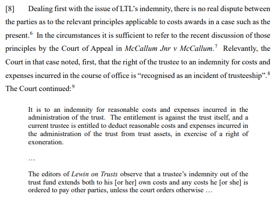 Importantly, a trustee’s right to indemnity applies to costs “properly incurred.” See New Zealand Māori Council v Foulkes. As noted in McCallum Jnr v McCallum “Careless and unreasonable conduct in the conduct of litigation” may deprive a trustee of rights of indemnity. Also stated in McCallum “[a] trustee partisan in his [or her] own interests or the interests of only some beneficiaries likewise may be deprived of indemnity.”