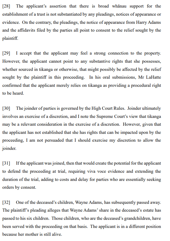 While tikanga may be applicable, there needs to be a specific path to this, rather than a generic consideration. As noted in Doney v Adlam at [110]: