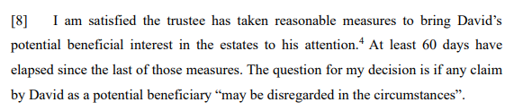 However, as David was not missing, rather David simply would not respond to any communications from the Trustee, the question for the Court set out at [9] was whether the “… transfer of David’s interest to the Crown under s 149 may better accord with the terms of the Glues’ wills, leaving David opportunity to claim his entitlement if ever he cared to do so.