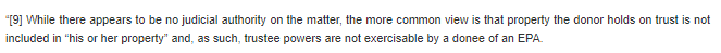 The starting point is the terms of the trust instrument. The law prior to the Trusts Act was clear that an attorney under an enduring power of attorney (EPOA) could not exercise powers of appointment. The Trusts Act now permits this in certain circumstances.