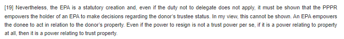 The fact that a power may have fiduciary obligations does not of itself bar a finding that there is a property right. However, the fundamental question is whether a power to appoint or remove a beneficiary is property for the purposes of the Protection or Property and Personal Rights Act 1988 (PPPR). This is addressed by Nation J at [19] in Godfrey v McCormick: