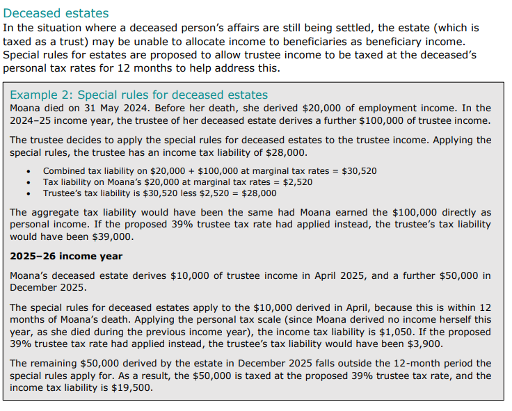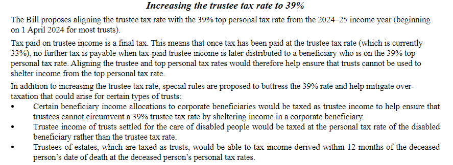The Government has announced its intention to align the trustee tax rate with the 39% top personal rate effective 1 April 2024. A limited exemption is proposed for deceased estates.