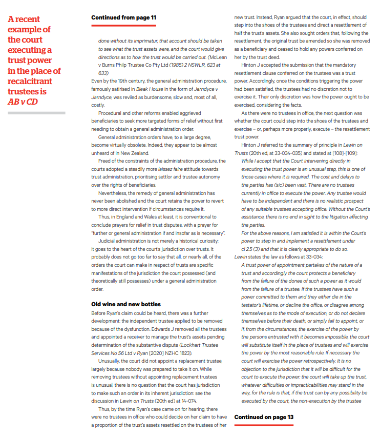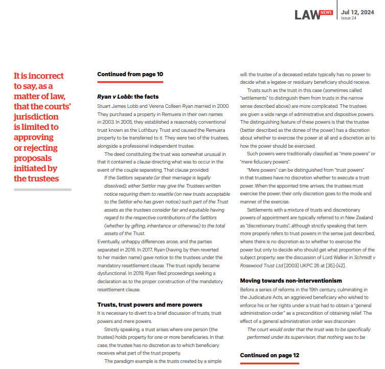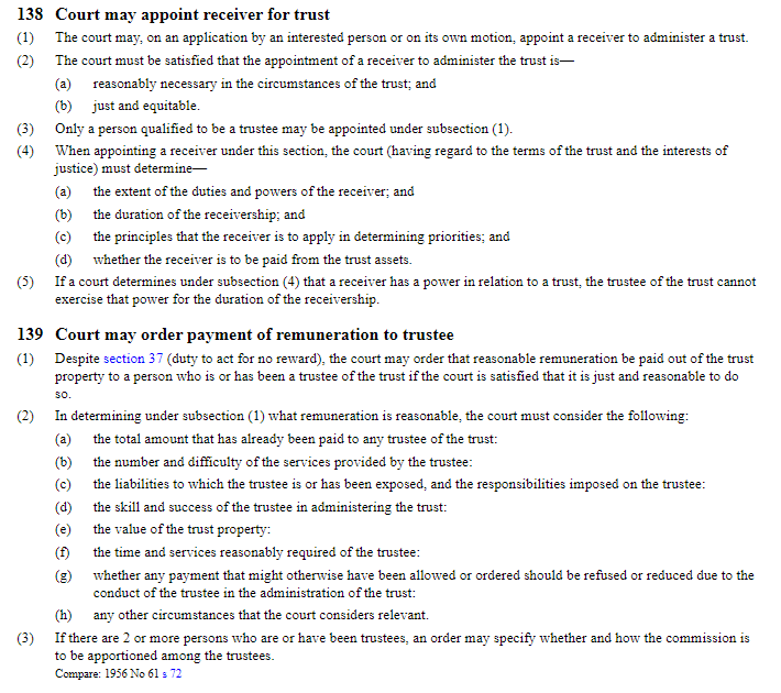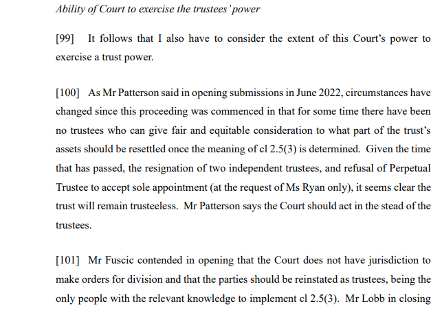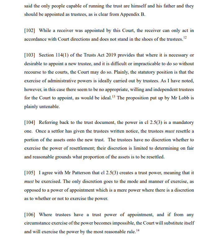 In separate proceedings instigated by the then independent trustee, as noted at [44] “… In a judgment dated 27 July 2020, Edwards J removed all three trustees and appointed a receiver, Digby Noyce, to the trust. There remains no trustee in office. In about April 2022 Ms Ryan inquired whether the Perpetual Guardian would be prepared to be appointed sole trustee but they declined.” While the absence of any trustees may raised questions as to the validity of a trust, perhaps surprisingly the essential elements of a trust do not include a trustee. See the Trusts Act 2019 at section 15. Accordingly, for the duration of the receivership it may be that this lacuna in the trusteeship is of no moment in light of the provisions of section 138 of the Trusts Act (Court may appoint a receiver for a trust), and in particular section 138(5), which provides that “If a court determines under subsection (4) that a receiver has a power in relation to a trust, the trustee of the trust cannot exercise that power for the duration of the receivership.”