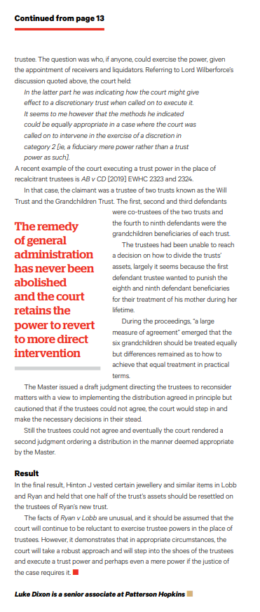 Ryan v Lobb, as was also the case in Potter v Duffy, highlights the difficulties with resettlement provisions that may “make sense” in the context of an initial finite asset transfer, but become problematic following the passage of time and the attendant ebb and flow of trust assets and liabilities.
