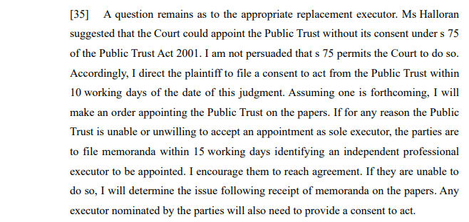 In the circumstances the court had no difficulty finding that all executors should be removed. However, the replacement executor or executors was problematic as although Public Trust was proposed as the replacement executor, Public Trust had not been asked to consent to the appointment. As stated at [34]:
