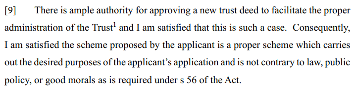 It is suggested that the reasoning of the court is not limited to charitable trusts and that this case provides practical guidance for trustees of trusts with limited or no documented terms.