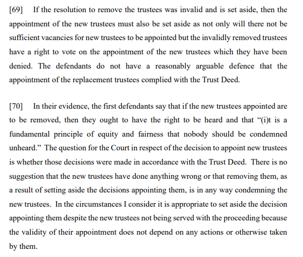 Where trustees are invalidly appointed, their position is essentially void ab intio, notwithstanding any lack of wrongdoing on their part. This is clearly set out at [69] to [70] as follows: