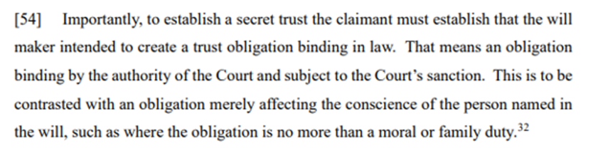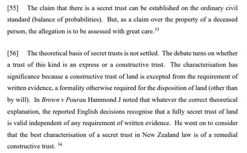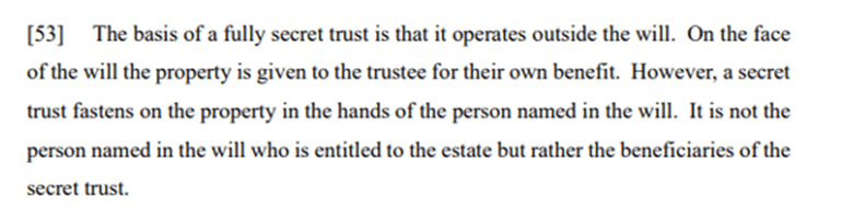 A secret trust is an arrangement between a will-maker and a trustee that is effective on death.[2] As noted by Anderson J at [53] to [56]: