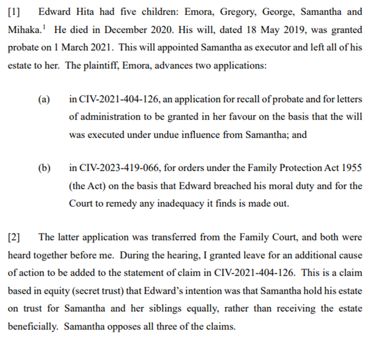 In Hita v Hita[1] the deceased left his entire estate to one of his children. The background of matters is set out at [1] and [2] of Anderson J’s decision as follows: