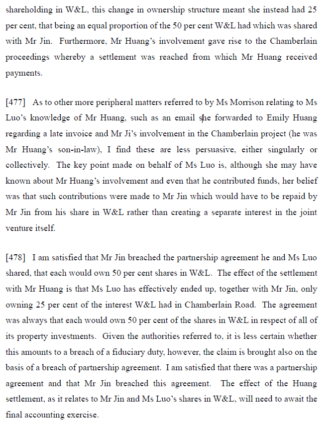 By way of background Jin v Luo relates to a break down in a business relationship that was complicated by the lack of documentation regarding the purchase of a number of properties. The legal analysis required was complex. Amongst other things Harland J determined that five of the properties that the proceedings related to were subject to a constructive trust. Harland J also held that there were breaches of certain fiduciary obligations.