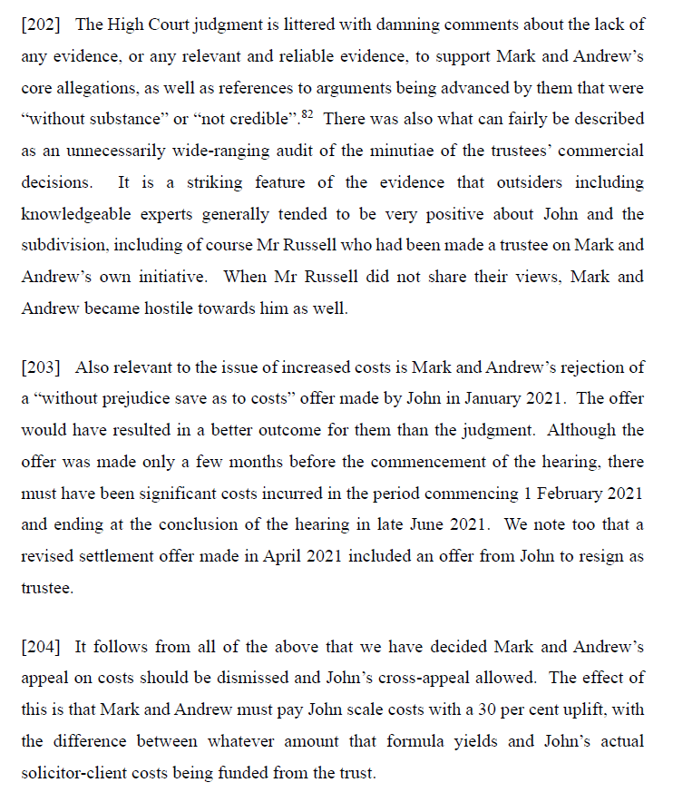 The sting in the tail was costs. The Court of Appeal overturned the 20% share of costs awarded against John on the basis that his late retirement did not significantly increase Mark and Andrew’s costs. As noted at [197] to [198] and [202] to 204]: