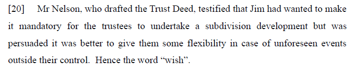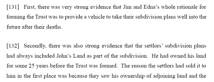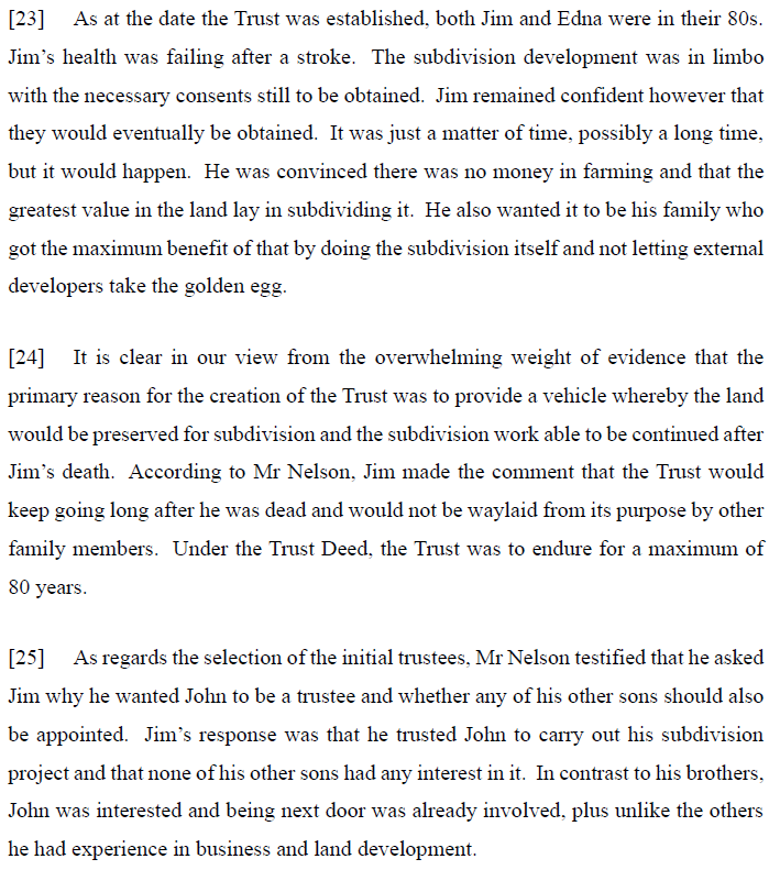 John was an actively involved trustee who personally guaranteed trust borrowings of up to $3.7million. As noted at [35] “Had he not done so, the Trust would not have been able to proceed. In evidence John said he was prepared to provide the guarantee with the comfort that he could ensure the subdivision was properly managed.”