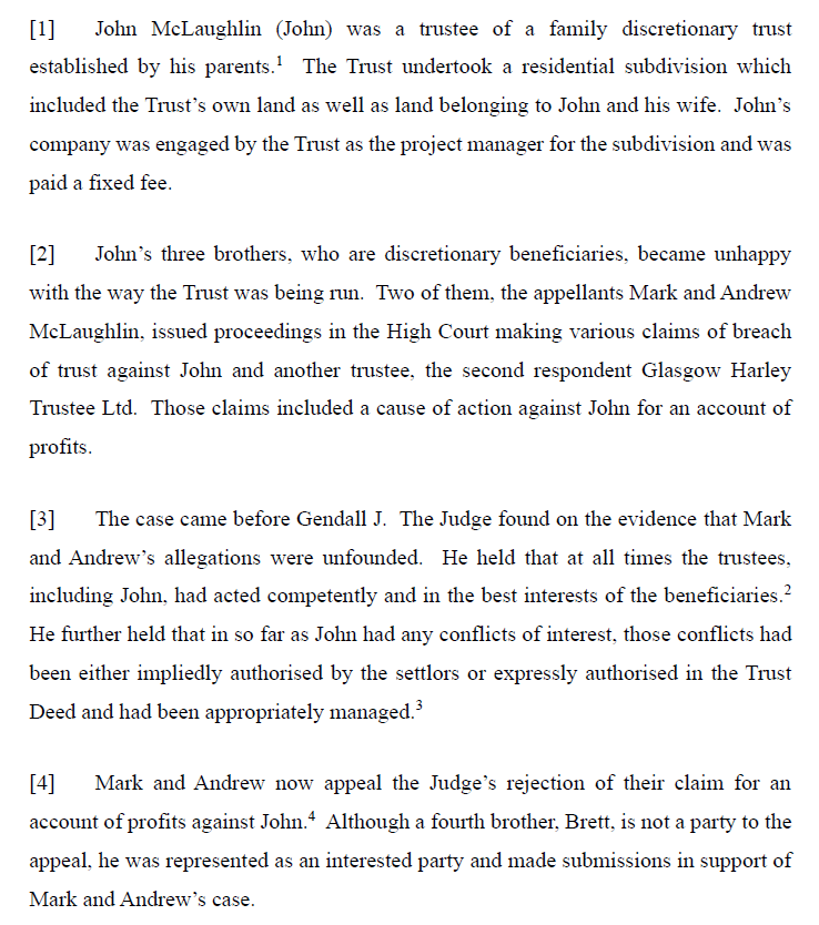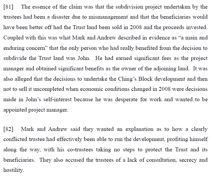 In or about 2011, John’s brothers Mark and Andrew became concerned about the property development. The Trust’s trustees took proactive steps in the face of this and as noted at [62]: