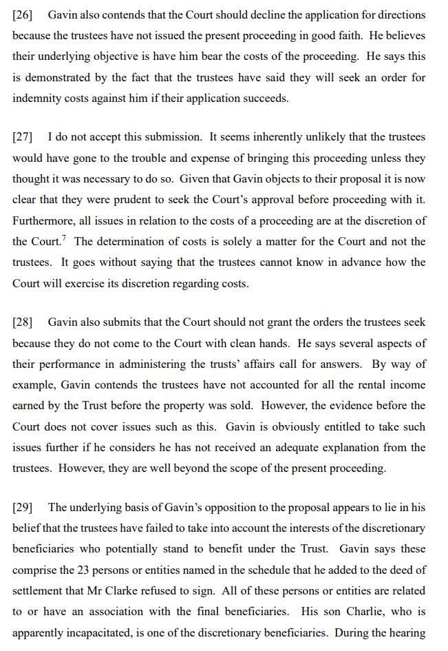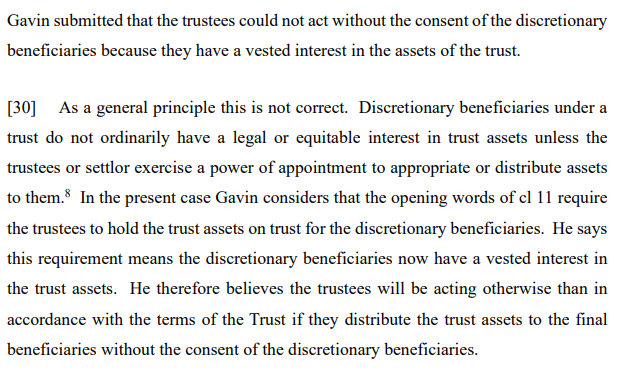 “The trustees wish to bring forward the vesting date and distribute the funds they currently hold to the six final beneficiaries named in the Trust. One of those beneficiaries, Mr Gavin Wallace (Gavin), opposes the application. He considers the Court, and not the trustees, should be responsible for making the decision as to what should happen to the assets owned by the Trust.“