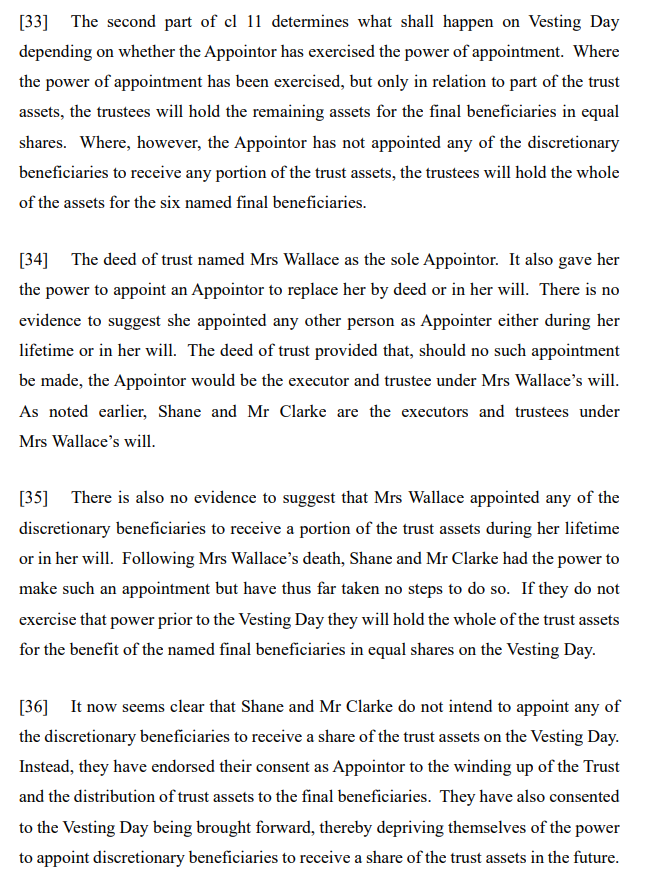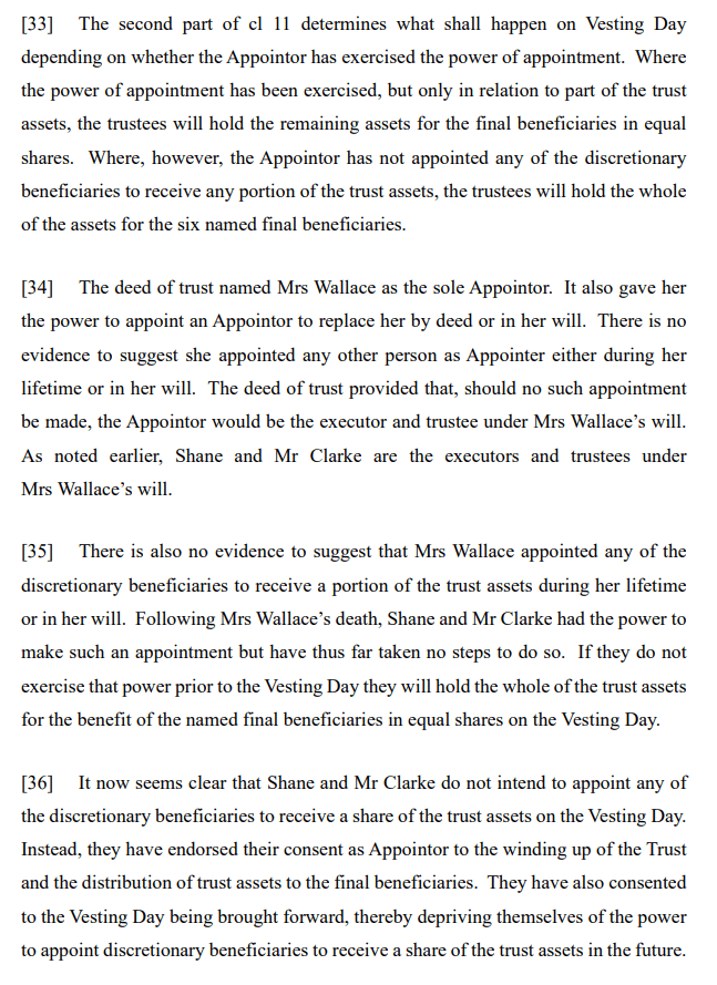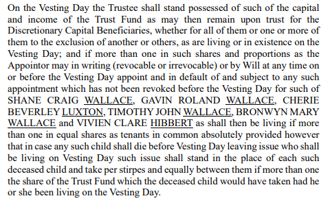 Wallace v Wallace relates to a decision of the trustees of the Ione Wallace Trust (the Trust) to bring forward the Trust’s vesting date. As set out at [4]: