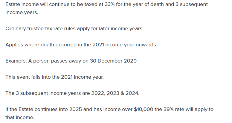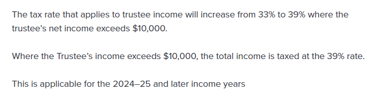 With limited exceptions the trustee tax rate has increased to 39% effective 1 April 2024.