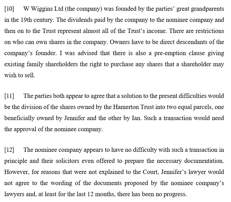 In Wiggins v Wiggins the court explores the parameters of section 145 of the Trusts Act, which provide that the Court, may, at the request of a Trustee or a beneficiary or on its own motion, submit any internal matter to an ADR process other than in the situation where the terms of the Trust indicate a contrary intention.