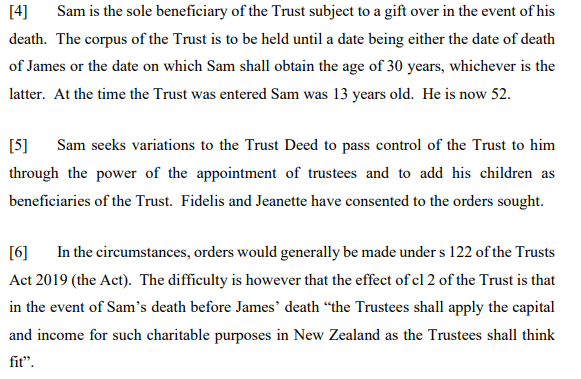 The Court was satisfied the Sam and his family needed to access the Trust funds without waiting for the death of the incapacitated settlor who is currently aged 94. Although not a specific requirement under part 6 the Court took into account the fact that the trustee and the settlor’s attorney had consented to the application. Accordingly, orders were made permitting the beneficiary’s application to vary the terms of to the trust to transfer the power of appointment to the sole named beneficiary and to add his children as beneficiaries.